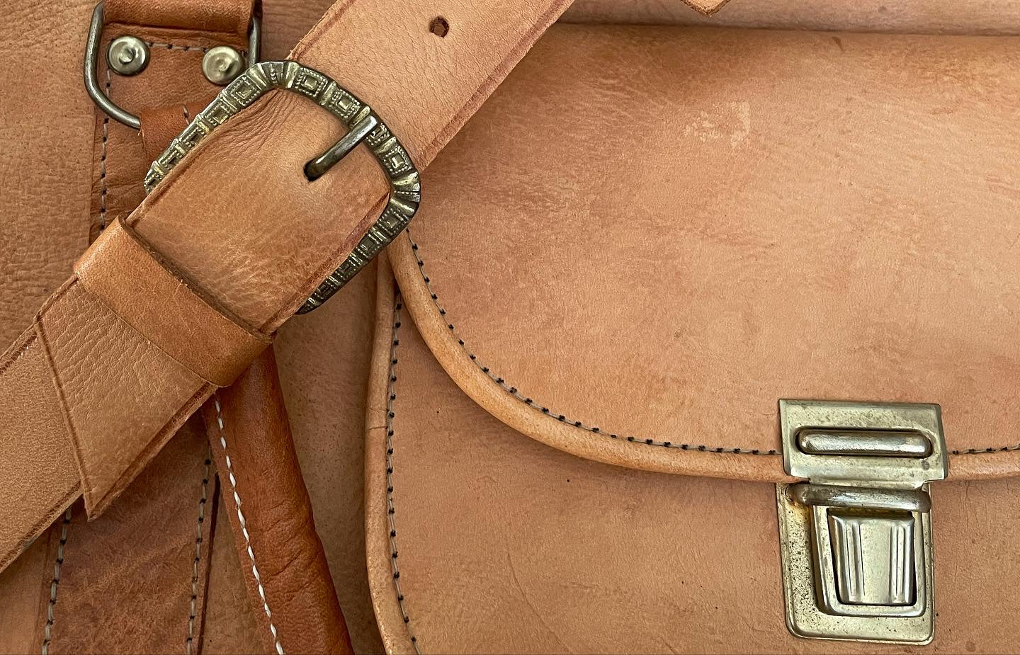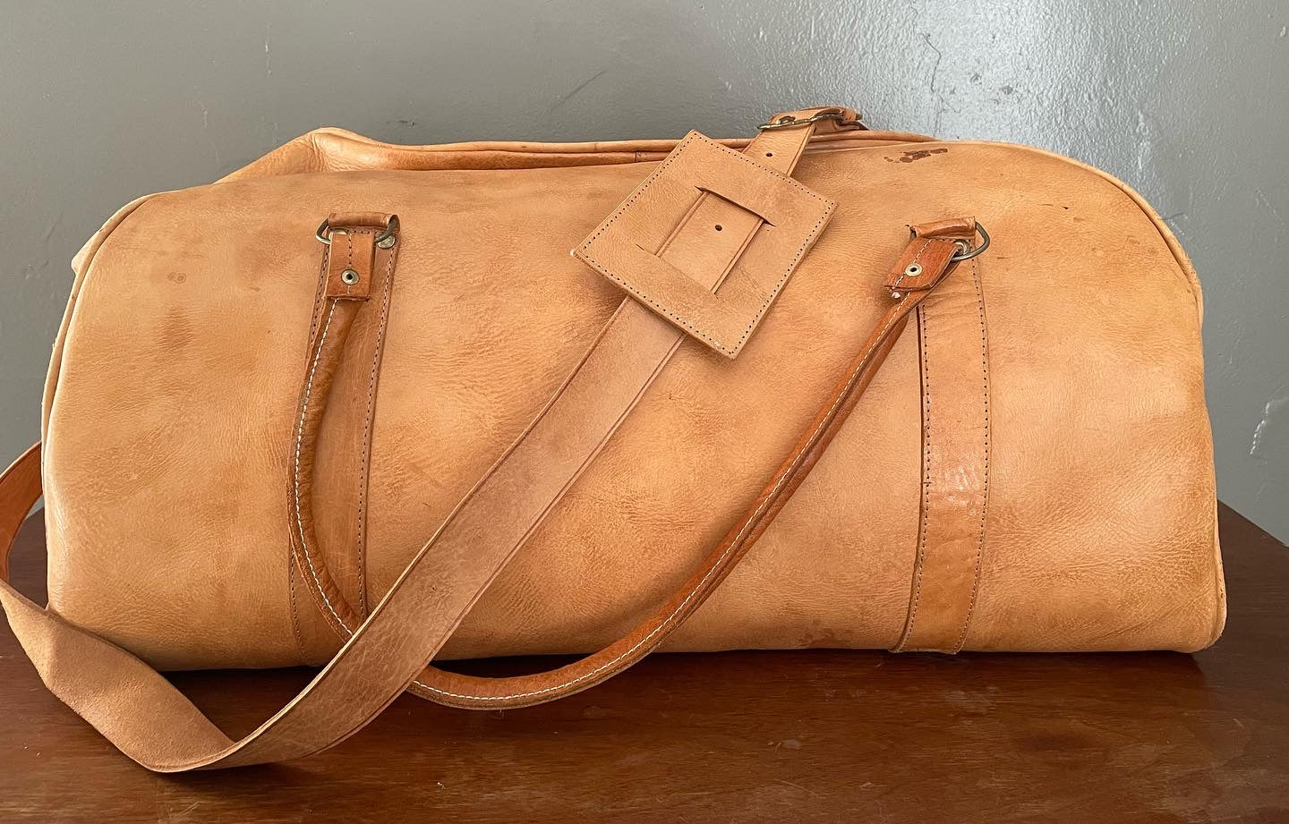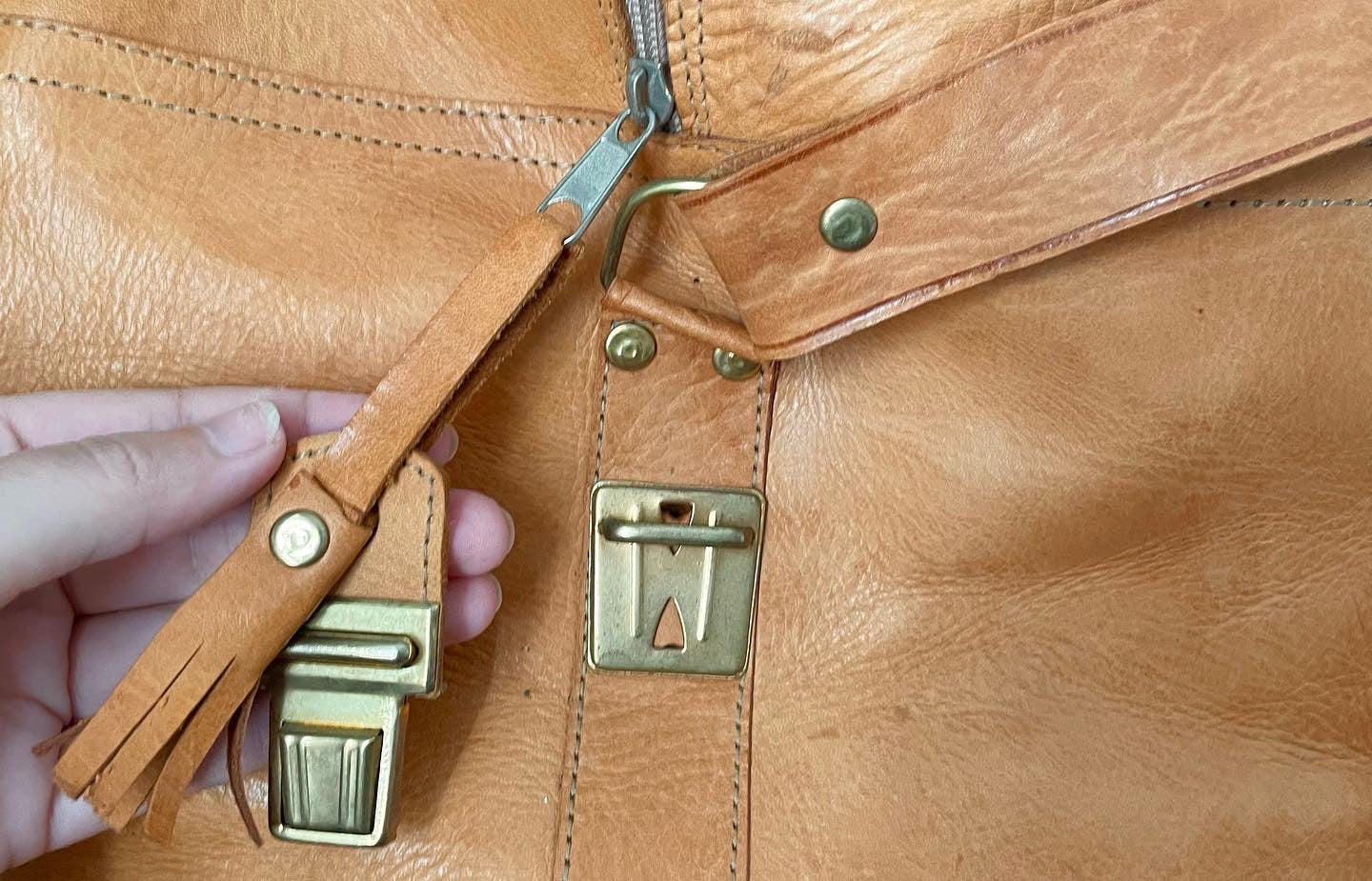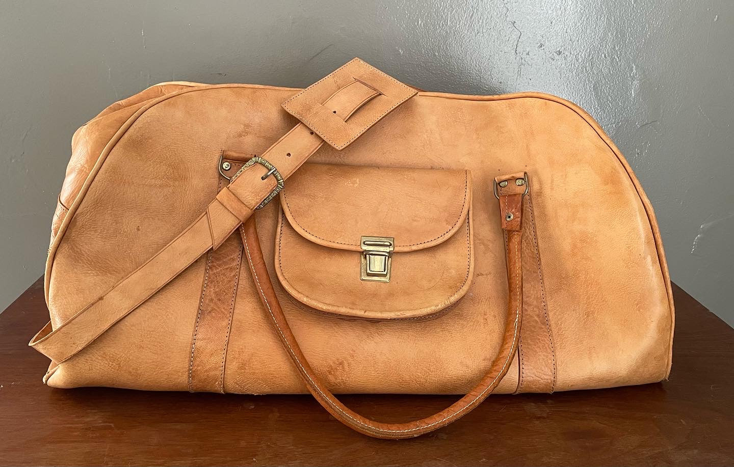 When I tell you I had a 20-minute debate with myself trying to justify keeping this. This bag is STUNNING. The leather is a nice light cognac color with some patina in the corners & handles, and the gold hardware has some nice detail too. The zipper works perfectly with no sticking, and it even has a little latch attached to the zipper to keep it closed while you’re on the go (pictured). There is no indication of a brand or designer anywhere on or inside the bag, so I’m not sure where it was made. It is a tad stiff and would probably love a good oil. There are a couple spots of wear, which add to its character. Measures 25”x13”.