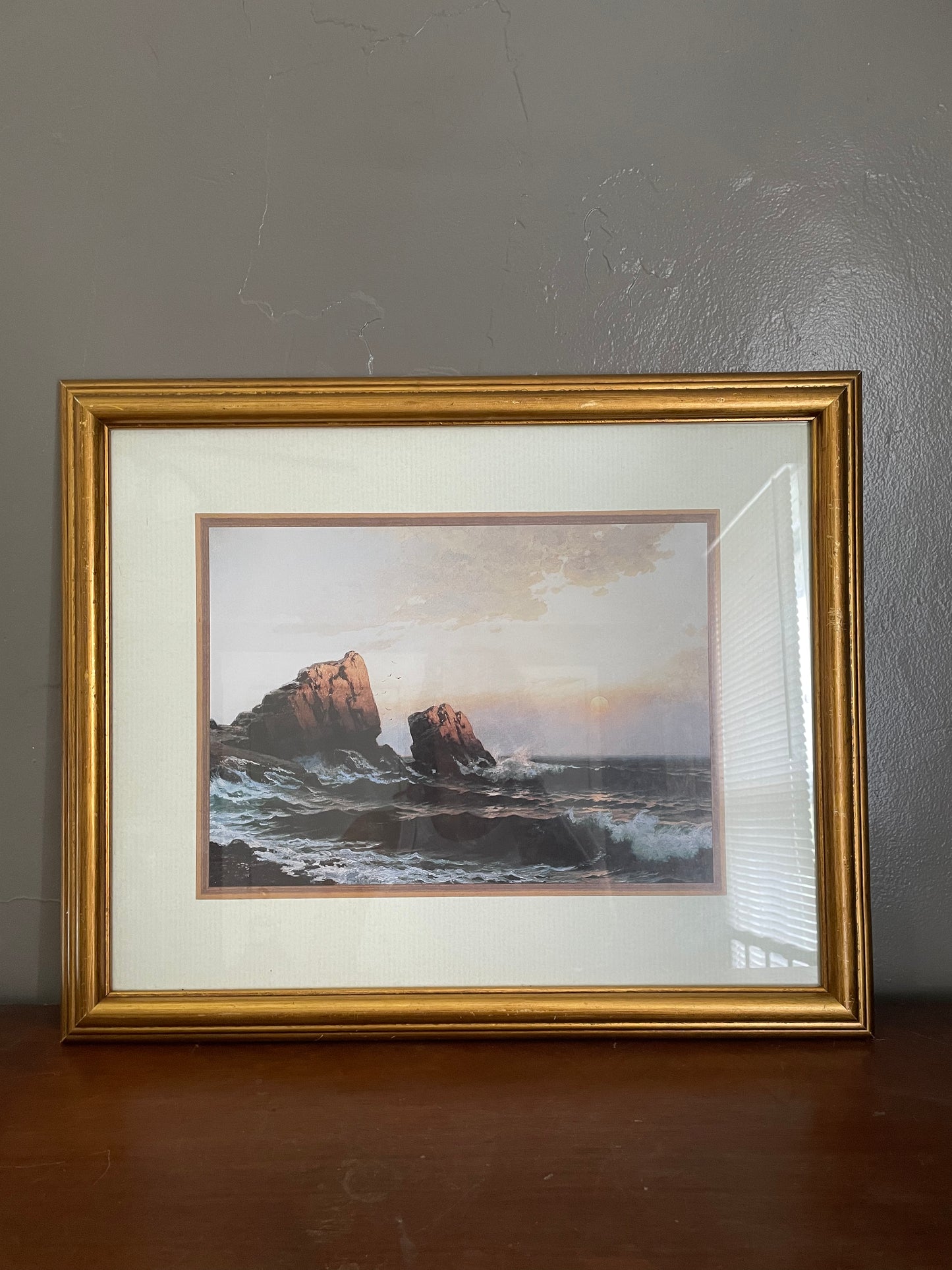 This piece has no artist signature and I haven’t been able to find anything out about it, but man is it beautiful! The gold frame really compliments the warmer tones. The frame does have some minor scratches and scuffs, and it is priced accordingly. Measures just over 22” wide and 18.5” tall.
