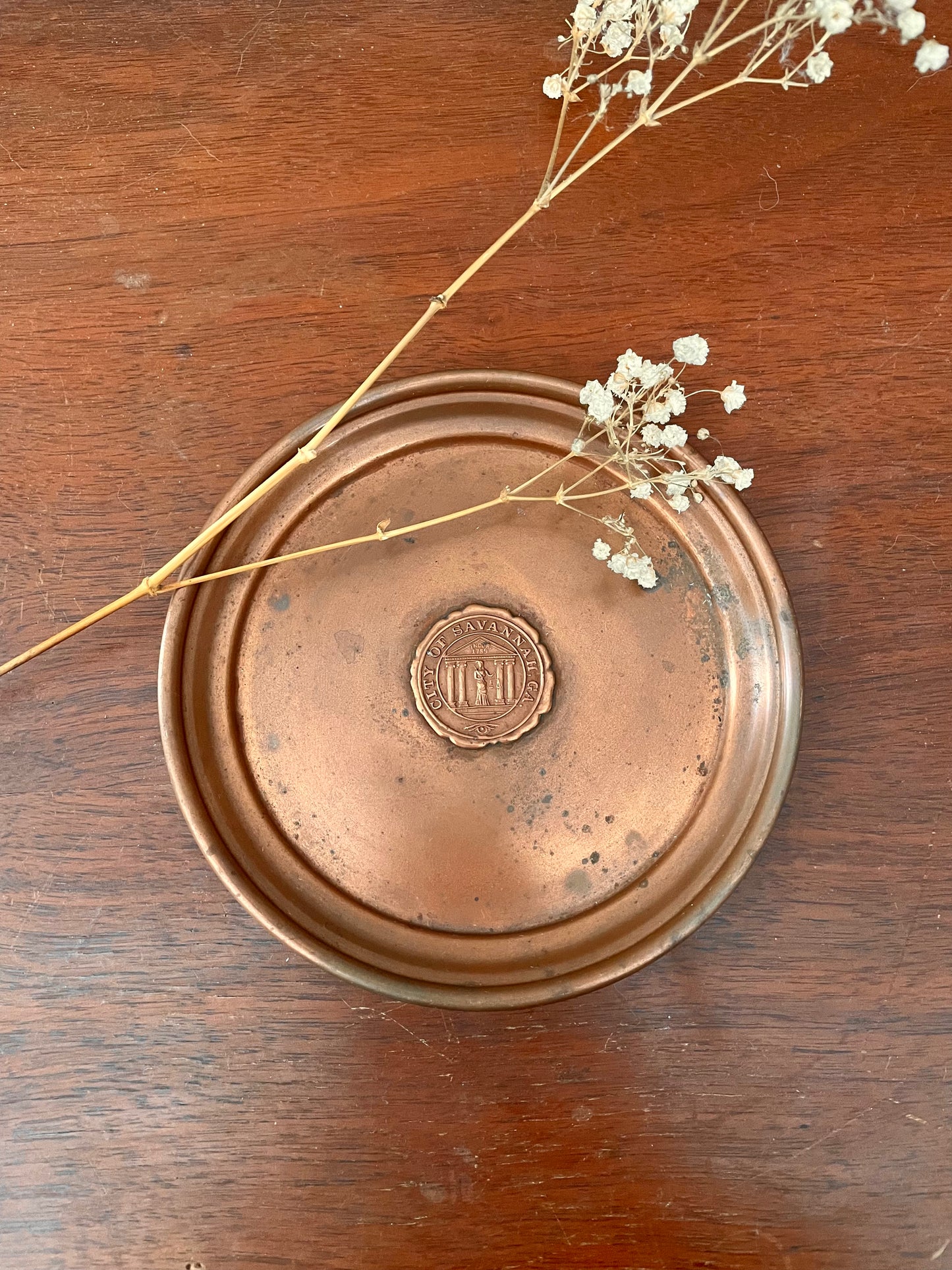 This little copper guy is proudly from the city of Savannah and has a beautiful patina. Could also be used as a coaster or jewelry catch-all. Measures 5” across.
